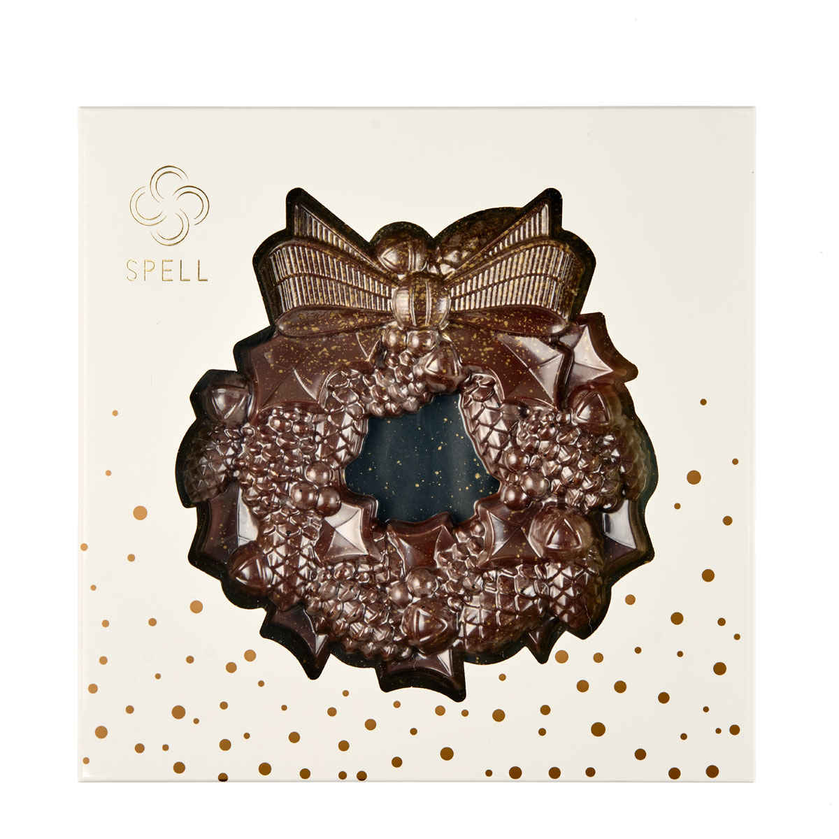 Milk chocolate “Wreath,” caramel snowflakes and Santas, chocolate Prosecco bottles, chocolate-covered cookies, and three types of caramel — everything you need to create your own space of festive magic. Add a cup for your favorite drink, and you have everything you need to make miracles happen. When you want a miracle, start with Spell.