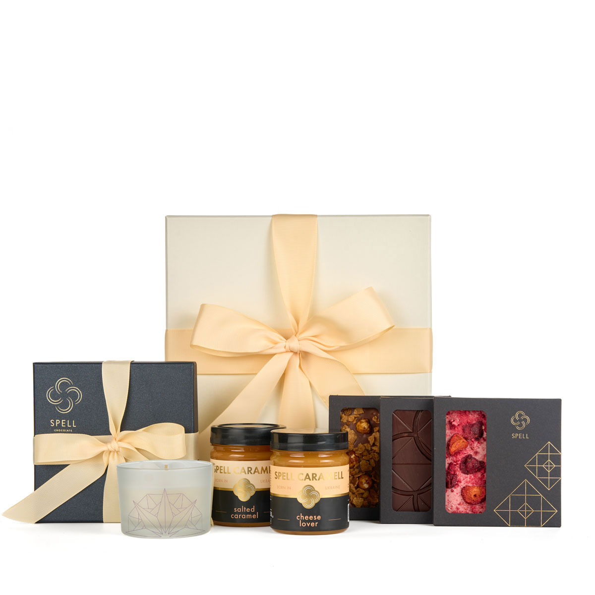 To slow down: a set of tiramisu, brownie, Napoleon, and Kiev cake-flavored candies, three chocolate bars, salted and cheese caramel, and a scented candle in a box.