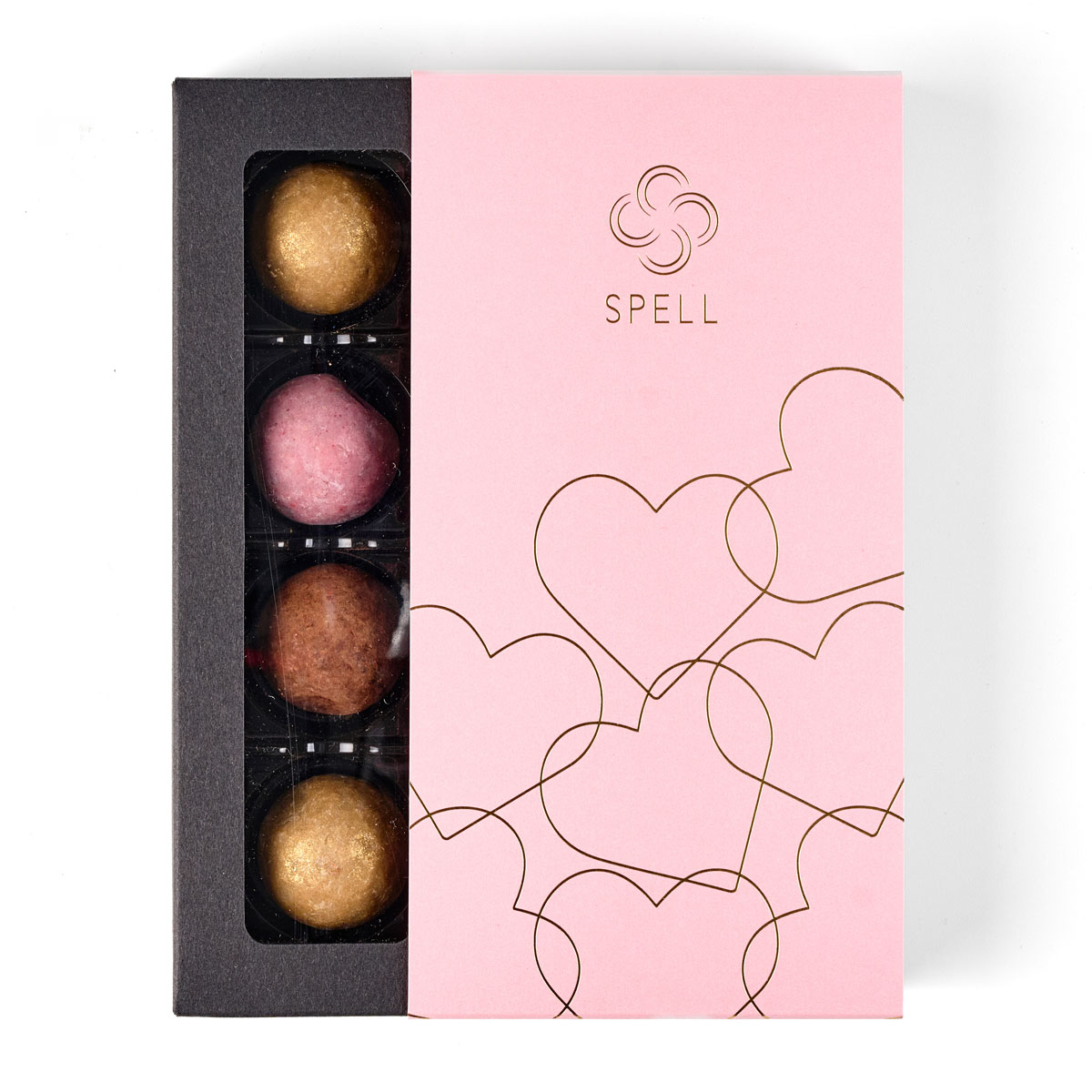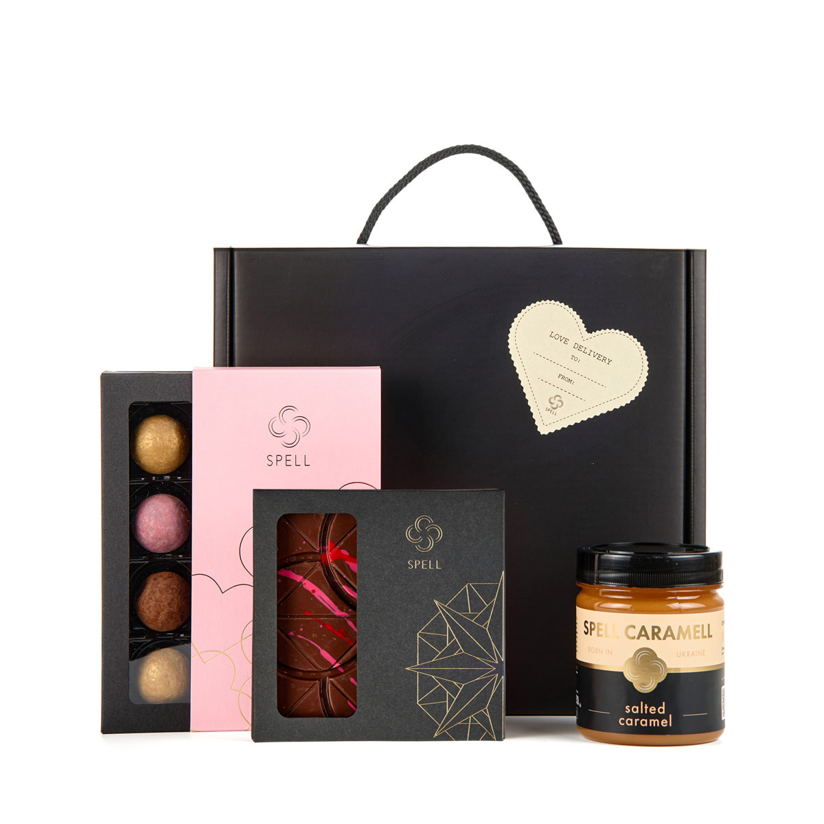 Salted caramel, milk chocolate bars with cherry marzipan, and assorted truffles.