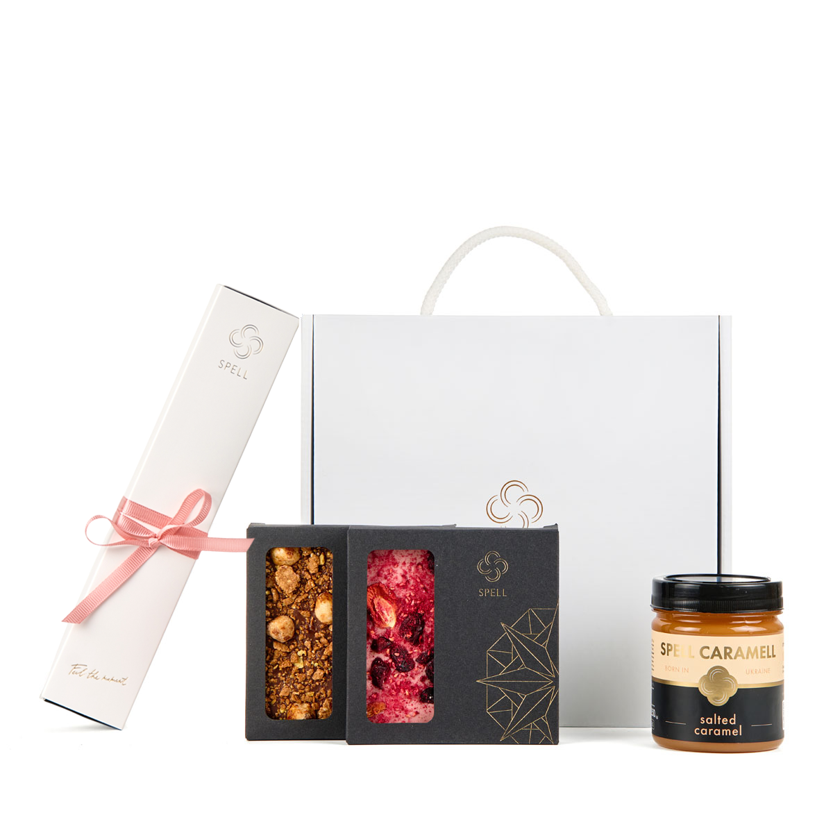 For those who deserve the shine of a thousand stars: salted caramel, white chocolate with cranberries, cherries, and raspberries, salted caramel bars, and a set of Spring candies.