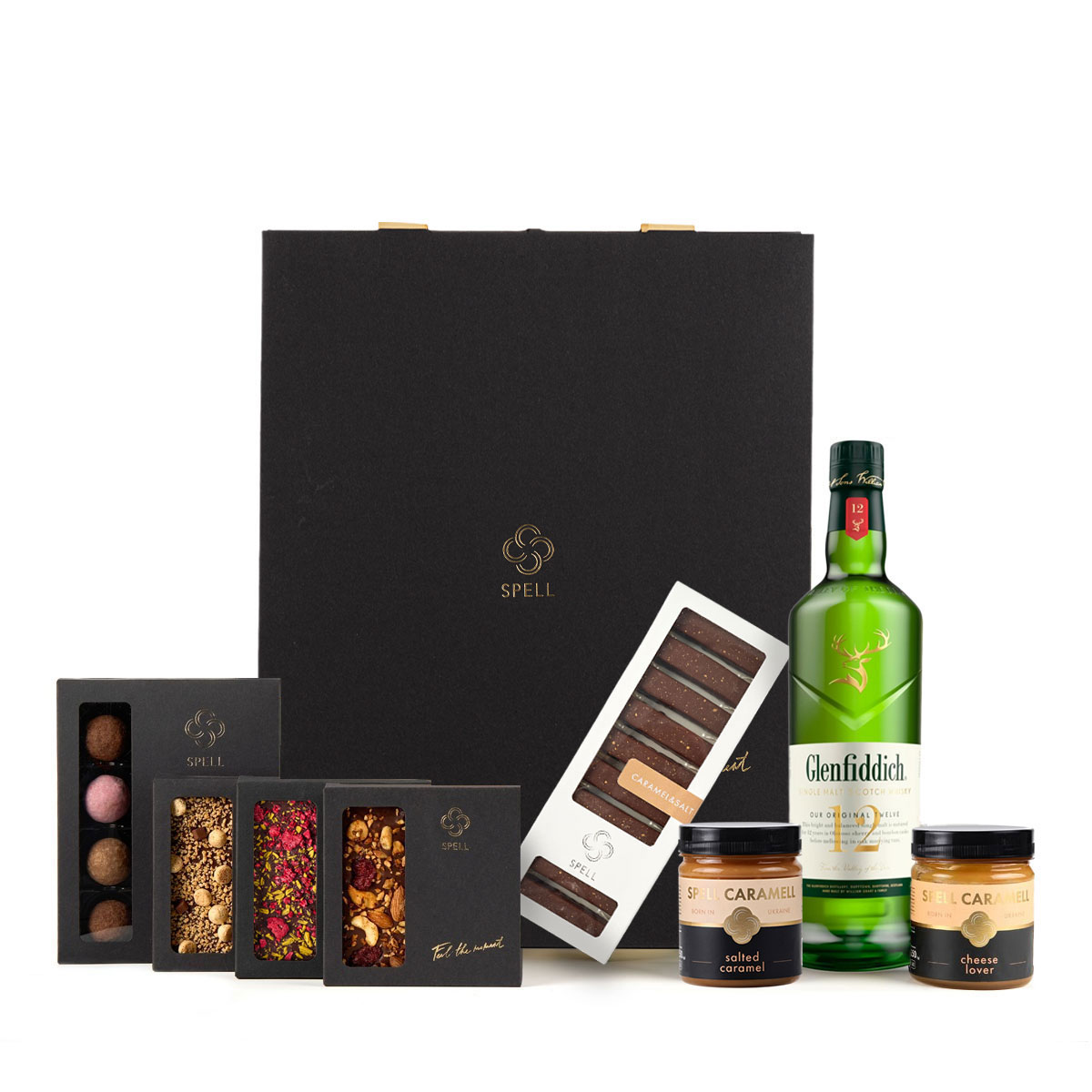 До набору входить: віскі, асорті трюфелів, плитка чорного шоколаду із апельсином та малиною, плитка молочного шоколаду з горіховим асорті, плитка шоколаду з солоною карамеллю, сирна та солона карамелі.