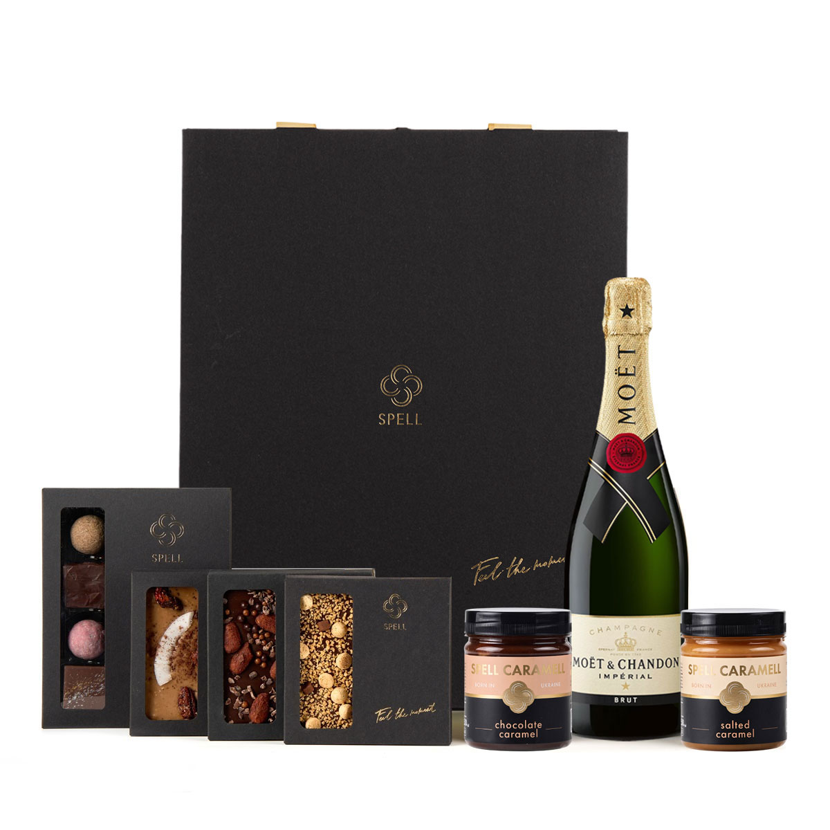 До нього входить: ігристе вино Moet & Chandon, Imperial, набір вишуканих цукерок, плитка темного шоколаду, плитка з темного та карамельного шоколаду з пеканом, плитка шоколаду із солоною карамеллю, а також солона та шоколадна карамелі.