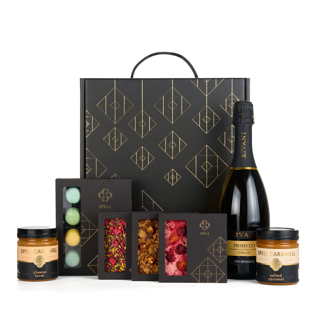 Асорті цукерок «Компаньйони» з дорблю, козиним сиром і пармезаном. Три плитки шоколаду: з апельсином та малиною, з білим шоколадом і ягодами та з солоною карамеллю, пластівцями й фундуком. Дві карамелі — солона й сирна. І пляшка ігристого, щоб вирушити в цю подорож з першим ковтком.