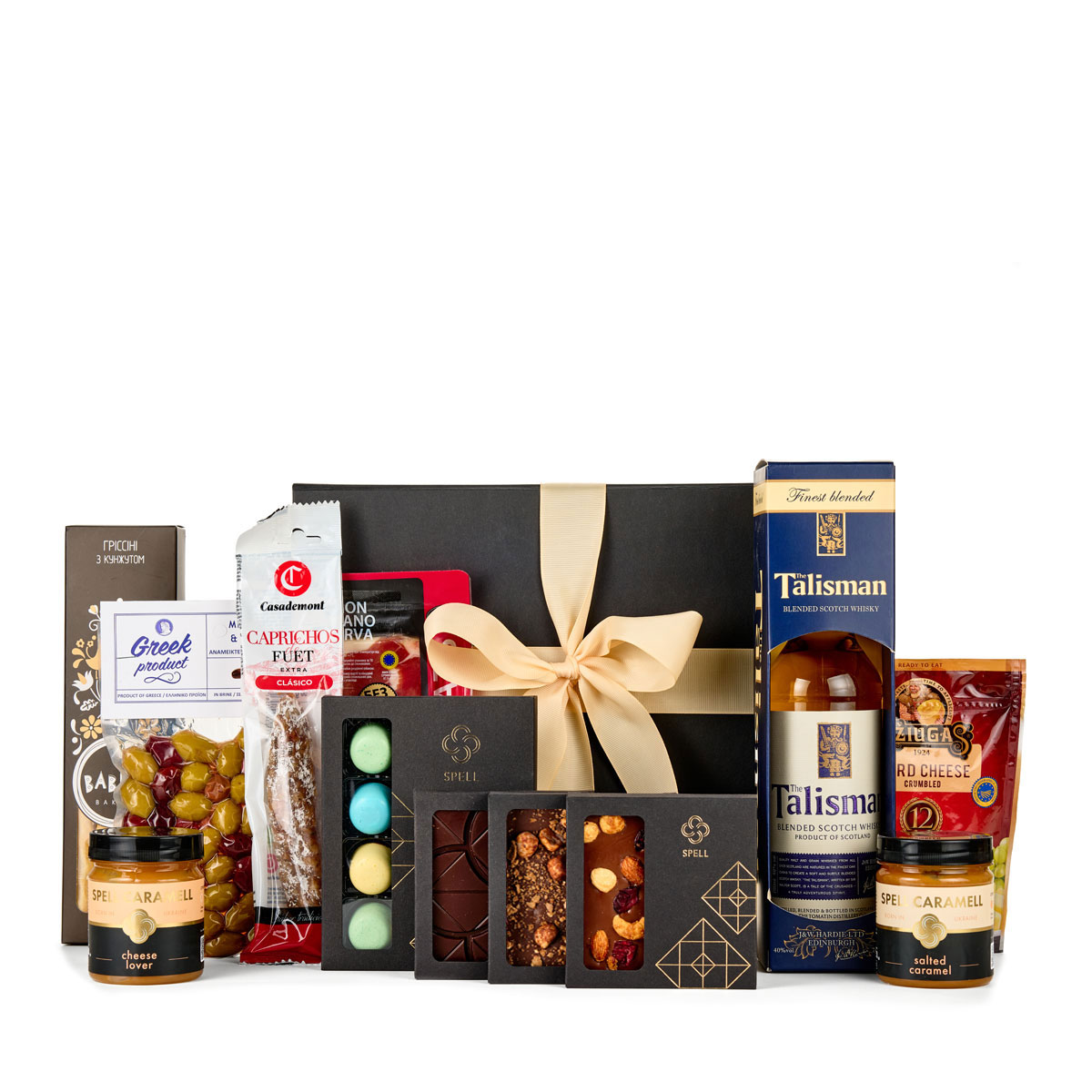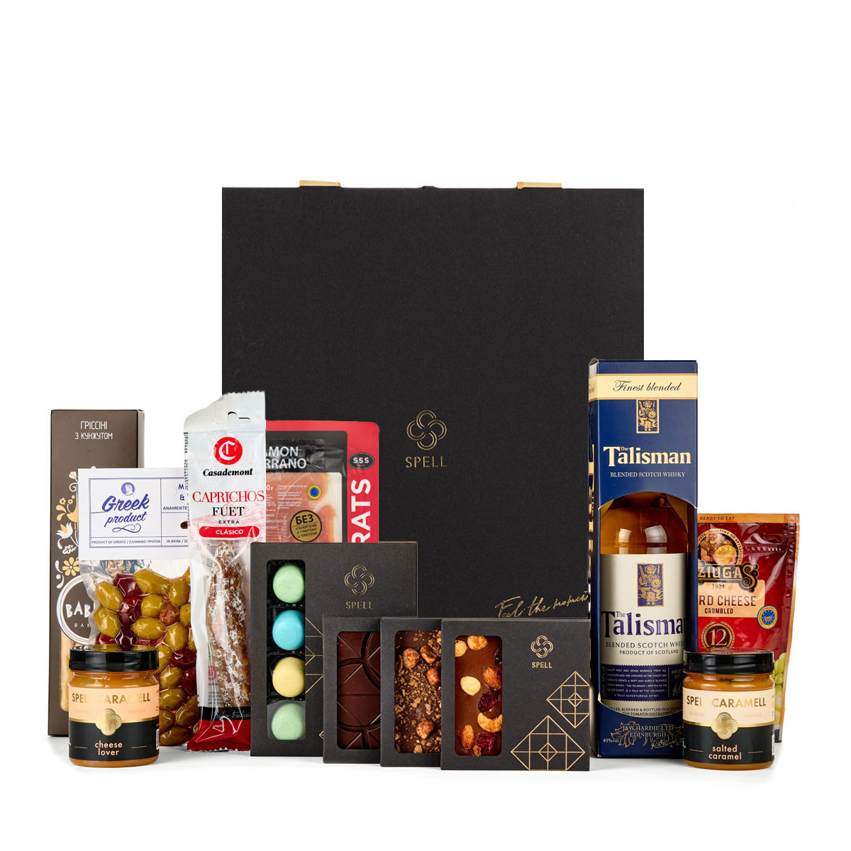 Хамон та фует, сир, оливки та грісіні, щоб їсти життя великою ложкою. Солодкими супутниками вражень стануть три плитки шоколаду, сет цукерок «Компаньйони», два смаки карамелі та віскі.