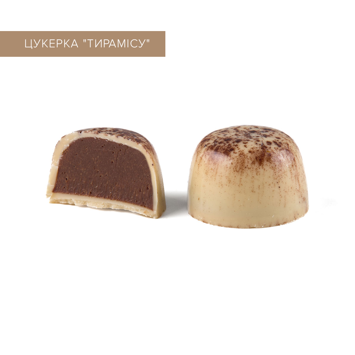 Склад цукерки "Тирамісу": шоколад білий 40,6% (цукор; масло какао; цільне порошкове МОЛОКО; емульгатор: СОЄВИЙ лецитин; натуральний ароматизатор ванілі), шоколад молочний 20,08%, вершки молочні 10,12%, шоколад темний 8,6%, коньяк Метакса 4,5%, еспресо зварений 3,5%, масло какао 2,99%, масло вершкове 2,86%, глюкозний сироп 2,86%, сорбіт, тримолін, какао порошок алкалізований, лецитин СОЄВИЙ, пюре ванілі, сіль.