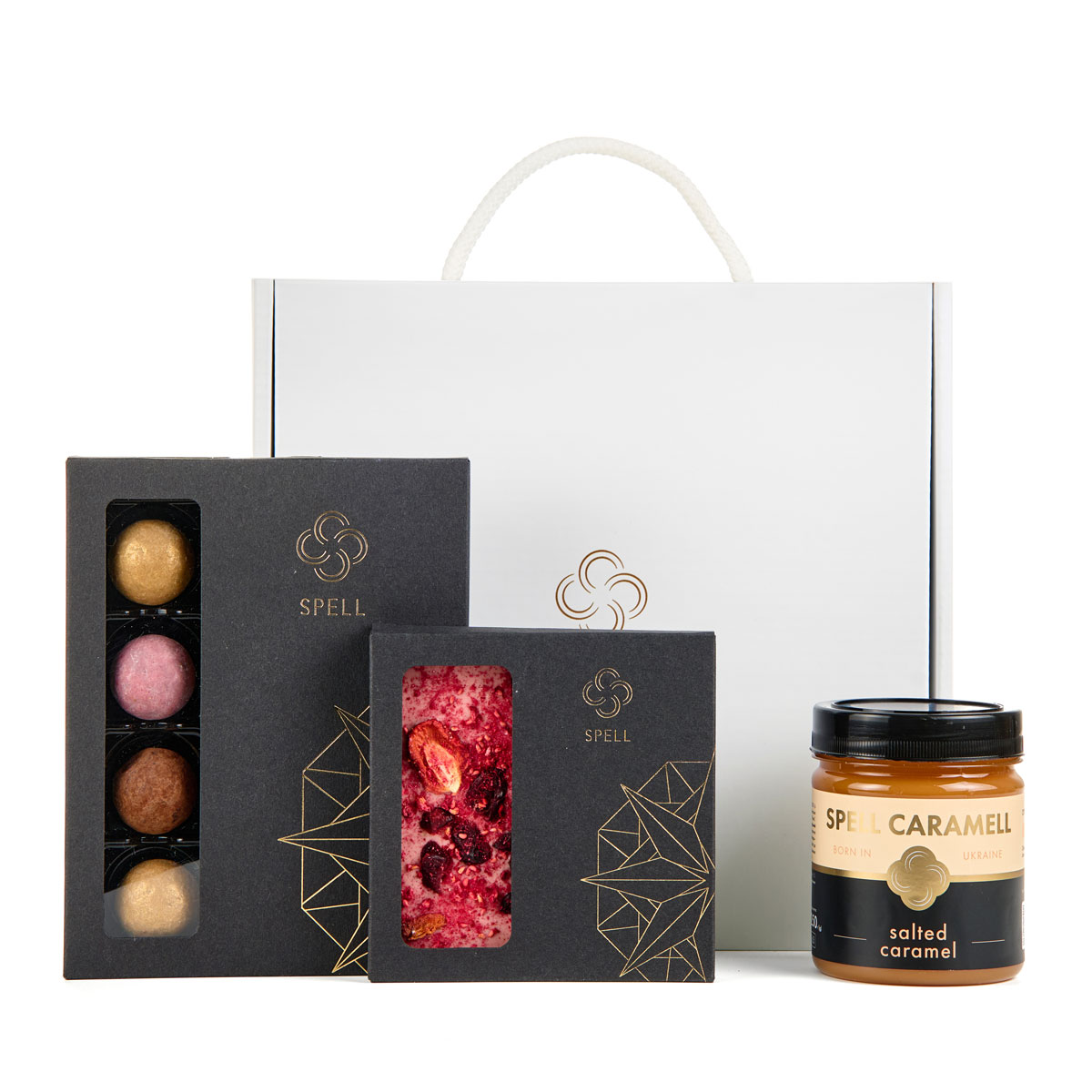 Піклуємось серцем, а не повідомленнями та голосовими. Тому даруємо справжнє, від серця: солону карамель з ваніллю, асорті трюфелів та плитку білого шоколаду з журавлиною, полуницею та малиною.