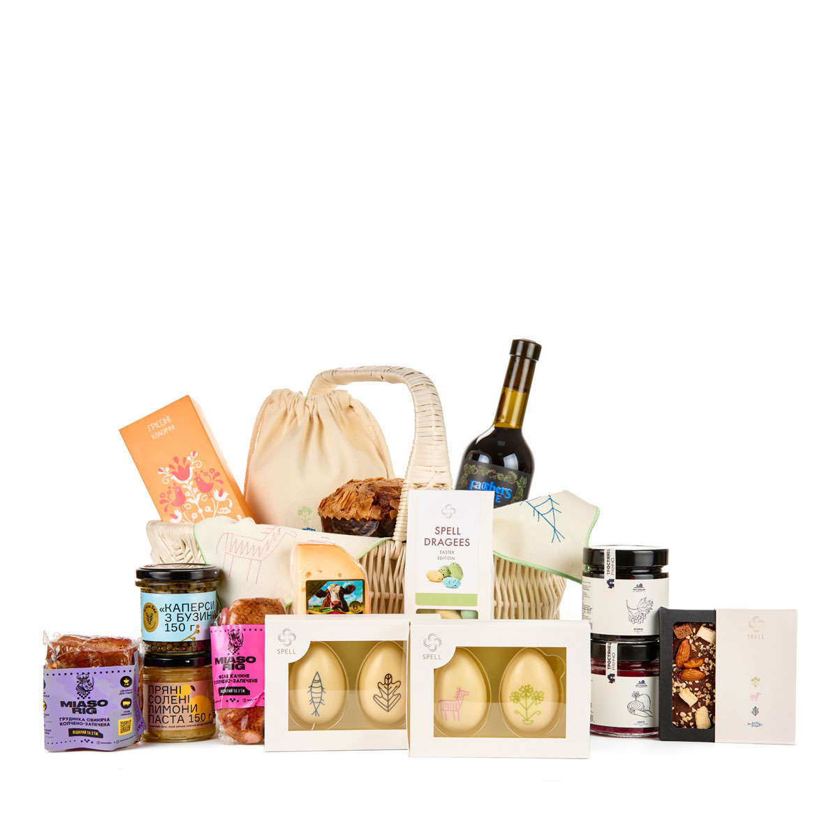 Мова любові цього сету – в його різноманітності. Навіть, якщо ви зовсім не готувалися до Великодня, цей кошик здатний наповнити стіл чи може плед для пікніку в парку. Ми поєднали смакові традиції різних регіонів і склали їх у великодній кошик під наглядом гастро-експерта Володимира Ярославського. Тут ви знайдете витриманий сир, грісіні, каперси з бузини, свину грудинку, цвіклі, квашені лимони з сіллю, сухе червоне вино, два набори цукерок із білого шоколаду з маршмеллоу, молочний шоколад з меренгою та мигдаль у білому шоколаді. І звісно паску від Марчук хліб.
